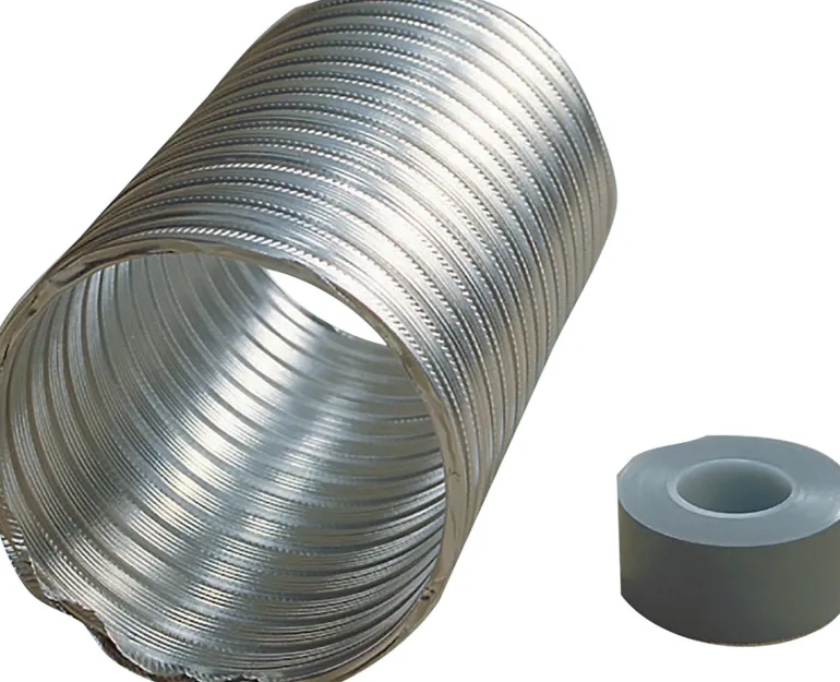 Seinän läpivienti joustavalla alumiinikanavalla. Mallin pituus on 500 mm, mukana teippi.