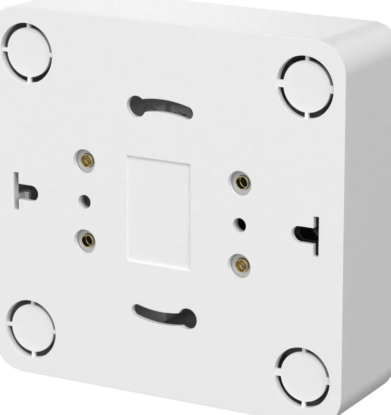 Seinäpistorasia kosketussuojalla. Kaksinkertaiset liitännät ruuviliitäntää kohti. Pohjalevyssä on syvennysaihiot 16 mm:n putkille.