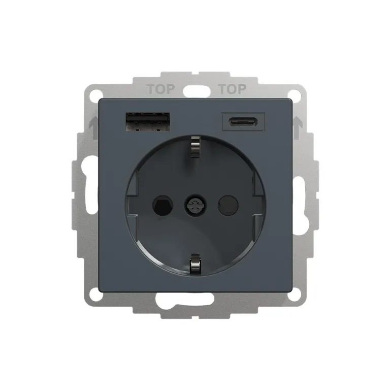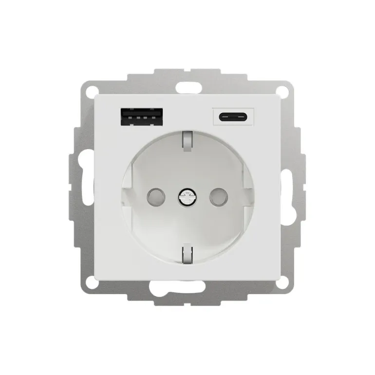 Valkoinen 1-osainen seinäpistorasia 2xUSB-latauksella, 3A tyyppi A+C. Pistorasia on maadoitettu ja siinä on pikaliitäntä ja kiinnityskourat. Kosketussuojattu uppoasennettavaksi kojerasiaan c/c 60 mm ja pinta-asennuksena 35 mm:n rasiaan.