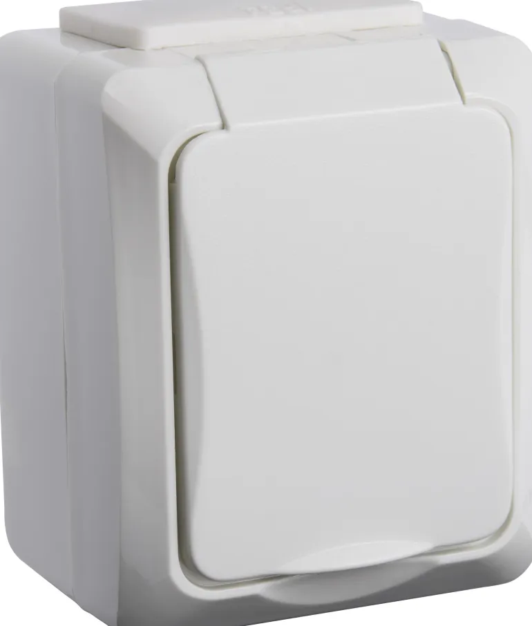 Maadoitettu, koteloitu, 2-osainen seinäpistorasia 16 A/250V itsesulkeutuvalla kannella, IP44 ja hyväksytty ulkokäyttöön.