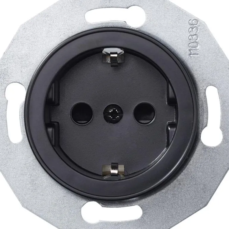 Maadoitettu, kosketussuojattu 16 A:n pistorasia pikaliitännällä. Upotettavaan IP20-asennukseen kojerasiaan c/c 60 mm. Toimitetaan kynsillä ja täydennettävissä halutulla Renova-kehyksellä.