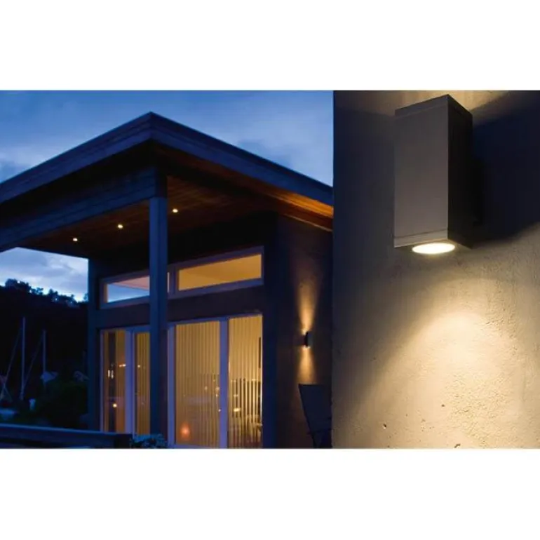 Grafiitinharmaa jauhemaalatusta valualumiinista valmistettu 4,5 W:n seinävalaisin, kirkas lasi, varustettu himmennettävällä GU10-kantaisella LED-valonlähteellä. Värilämpötila 2700 K, valovirta 180 lm ja hajontakulma 35°. Energialuokka A ja suojausluokka IP54.