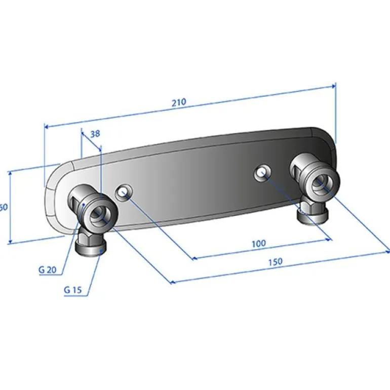 Ruostumattomasta teräksestä valmistettu sekoittimen kiinnike pintavedetyille putkistoille. Sen C/C-etäisyys on 150 mm, ja siinä on kääntyvät liitäntäkulmat ja tasotiiviste puoliliitäntöjä varten.