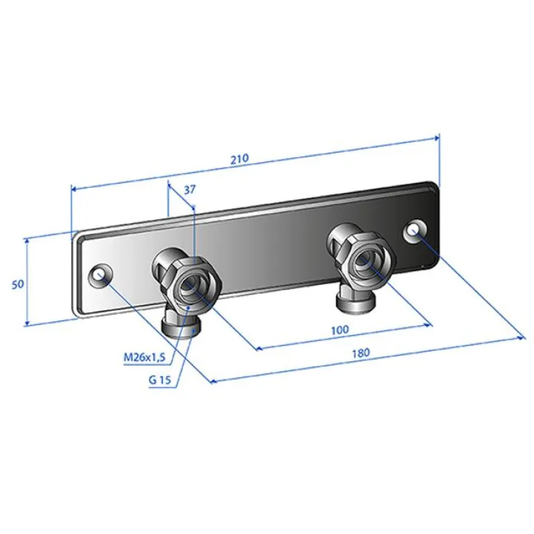 Trio Perfekta 8188696 on ruostumattomasta teräksestä valmistettu sekoittimen kiinnike, jossa kääntyvät liitäntäkulmat ja tasotiiviste puoliliitäntöjä varten. Pintavedetyille putkistoille. Liitäntöjen C/C-etäisyys 100 mm ja M26x1,5-sisäkierre sekoittimen liittämistä varten. Tuloliitännöissä on G15-ulkokierteet. Sekoittimen kiinnikkeen mitat ovat 50 x 210 x 37 mm. Mukana LVI-ruuvi asennusta varten. Ilman liittimiä