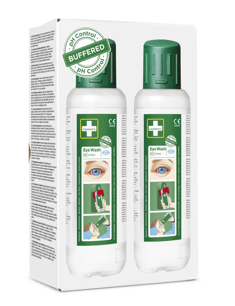Aloita silmän huuhtelu nopeasti. Vaikutus on tehokkainta ensimmäisten sekuntien aikana. Cederrothin silmähuuhde sisältää runsaan määrän huuhtelunestettä. Pullo on muotoiltu siten, että sillä voidaan huuhdella silmää runsaalla virtauksella n. 1,5 minuutin ajan. Pidä useita pulloja valmiina, sillä huuhtelun on jatkuttava pitkään, vähintään 15 minuuttia. Muotoiltu huuhtelukuppi ohjaa nesteen suoraan silmään ilman tarpeetonta valumista ja auttaa pitämään silmän auki huuhtelun aikana.