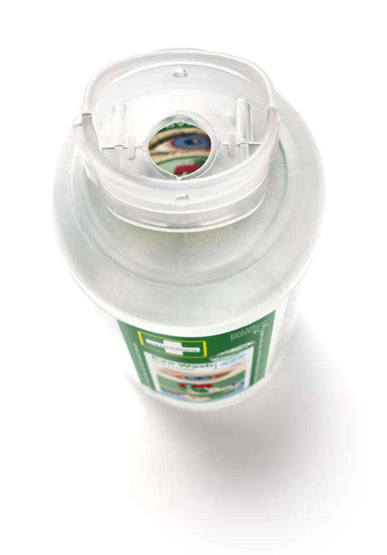 Pölyltä suojaava korkki pitää huuhtelukupin puhtaana. Korkki toimii myös avausvälineenä.