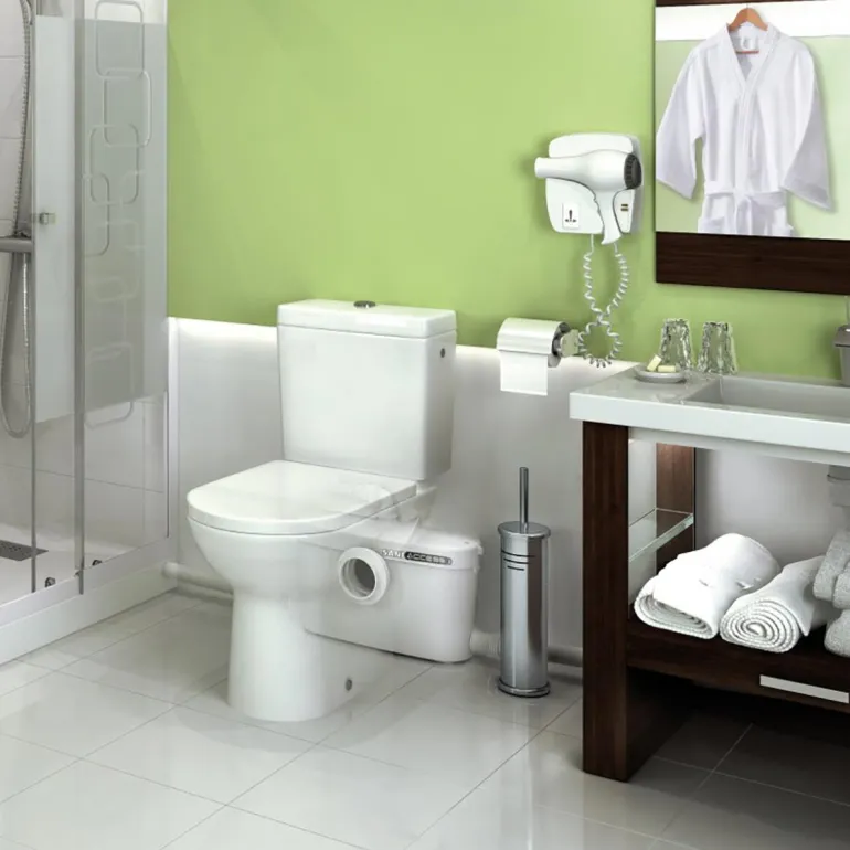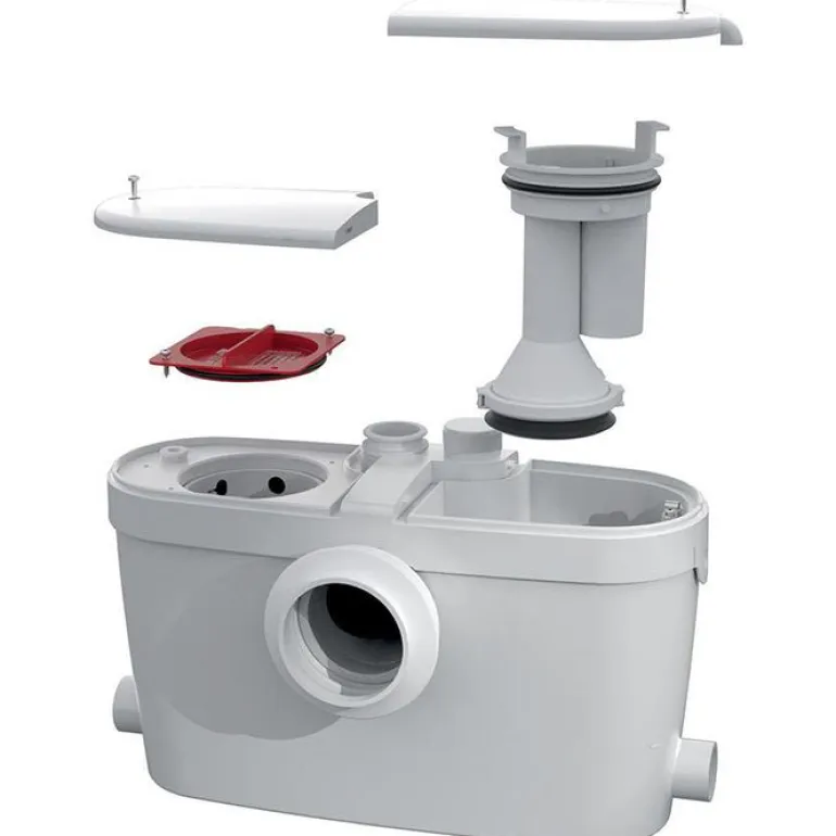 Silppuripumppu, joka pumppaa vettä pois koko kylpyhuoneesta, jossa on wc, pesuallas ja suihku. Pumppu on helppo asentaa, ja se sopii perinteisiin WC-istuimiin, joissa on P-lukko ja vähintään 6 l/huuhtelu.
