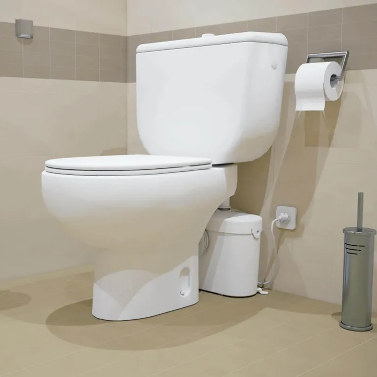 Silppuripumppu, joka pumppaa vettä WC:stä. Pumppu on helppo asentaa, ja se sopii perinteisiin WC-istuimiin, joissa on P-lukko ja vähintään 6 l/huuhtelu.
