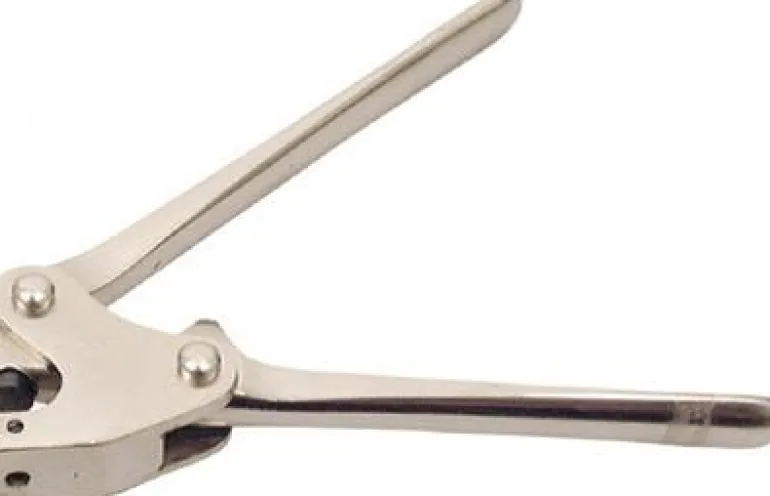 Nikkelöidyt sinetöintipihdit kaivertamattomille muovisineteille. Sinetöintipihdeissä on epäkeskiset kohokuviointivaihteet ja vaihdettavat pehmusteet.