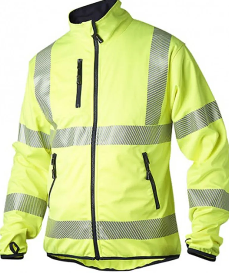 Kevyt ja joustava softshelltakki, jonka väri on huomiokeltainen. Täysvetoketju- ja ketjsusuoja, yksi vetoketjullinen rintatasku ja kaksi vetoketjullista etutaskua. Hengittävä joustava kangas. Leikattu joustava heijastin paremman käyttömukavuuden saavuttamiseksi. 100 % polyesteriä.