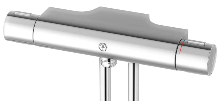 Gustavsbergin New Nautic-suihkuhana, jossa on useita käytännöllisiä ominaisuuksia miellyttävää suihkua varten. Hana voidaan täydentää kylpyammeen juoksuputkella.