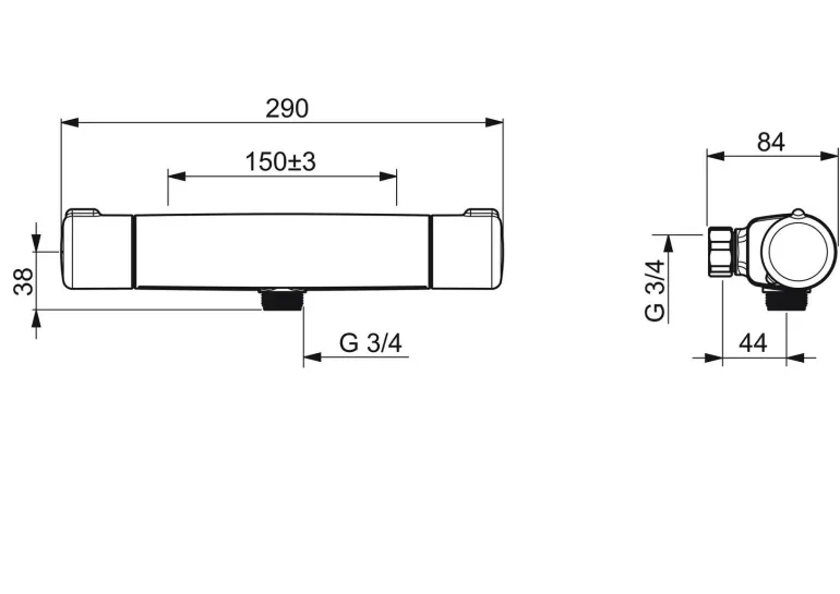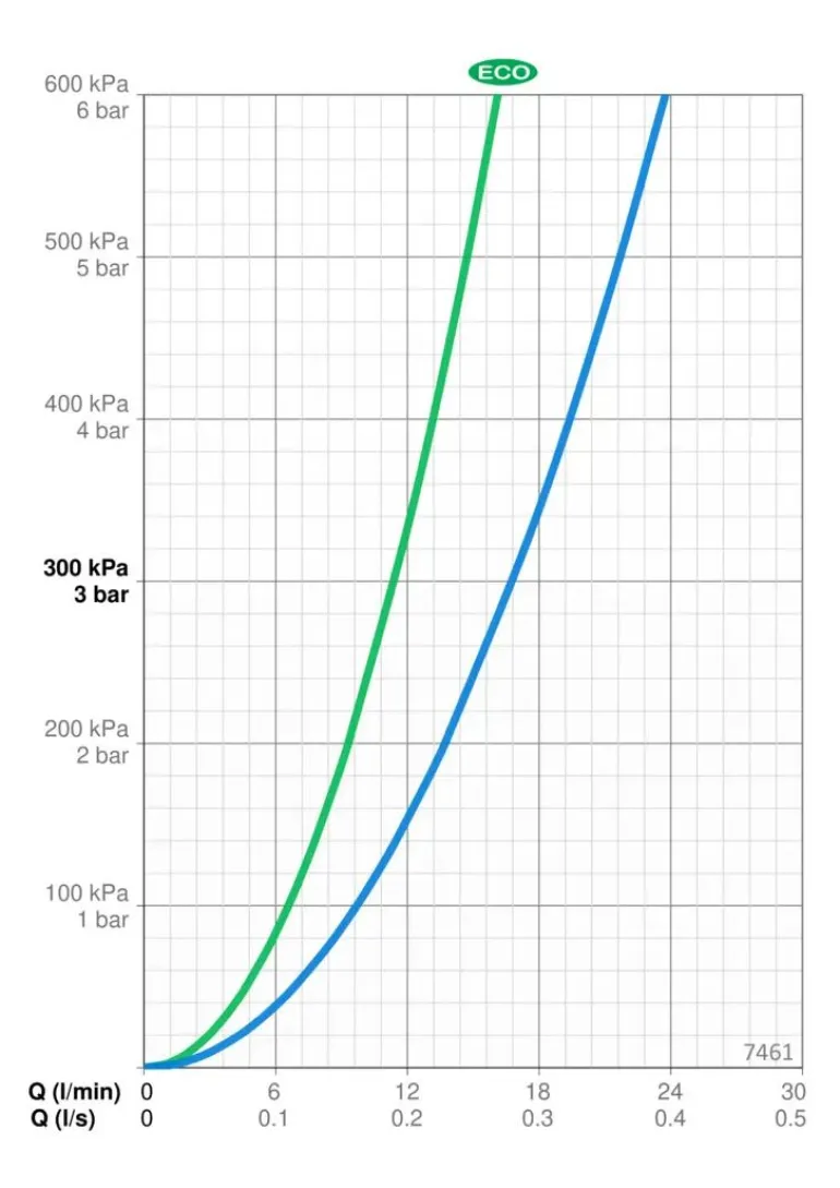 Termostaattinen suihkuhana, jonka lämmönsäätökahvassa on lämpötilanrajoitin joka voidaan ohittaa nappia painamalla. EcoFlow -virtaamasäädin. Hanassa on roskasihdit ja yksisuuntaventtiilit. Termostaattinen säätöosa.