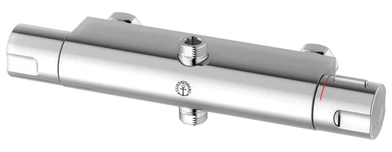 Gustavsbergin Nordic-suihkuhana, jonka yksinkertainen muotoilu sopii useimpiin kylpyhuonesisustuksiin. Sisäänrakennettu, automaattinen kuumavesisuoja suojaa palovammoilta. Rajoituspainike pitää veden lämpötilan 38 °C:ssa.