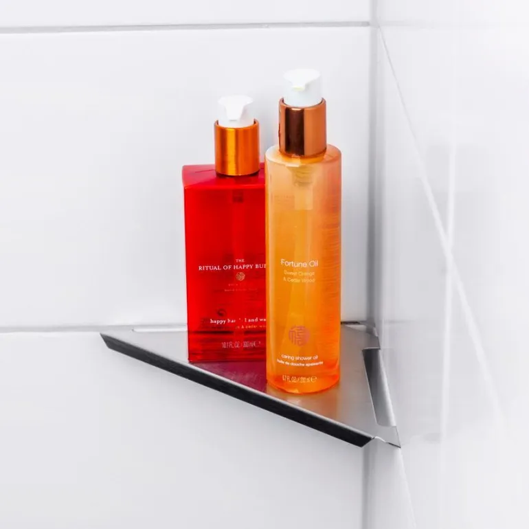 Tyylikäs suihkuhylly harjatusta ruostumattomasta teräksestä, tyyppi AISI 304. Hylly sopii 90 asteen kulmaan ja kiinnitetään liitokseen silikonilla.