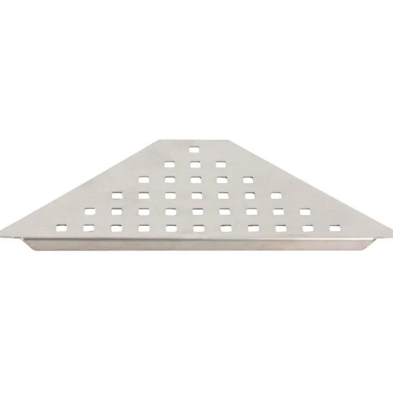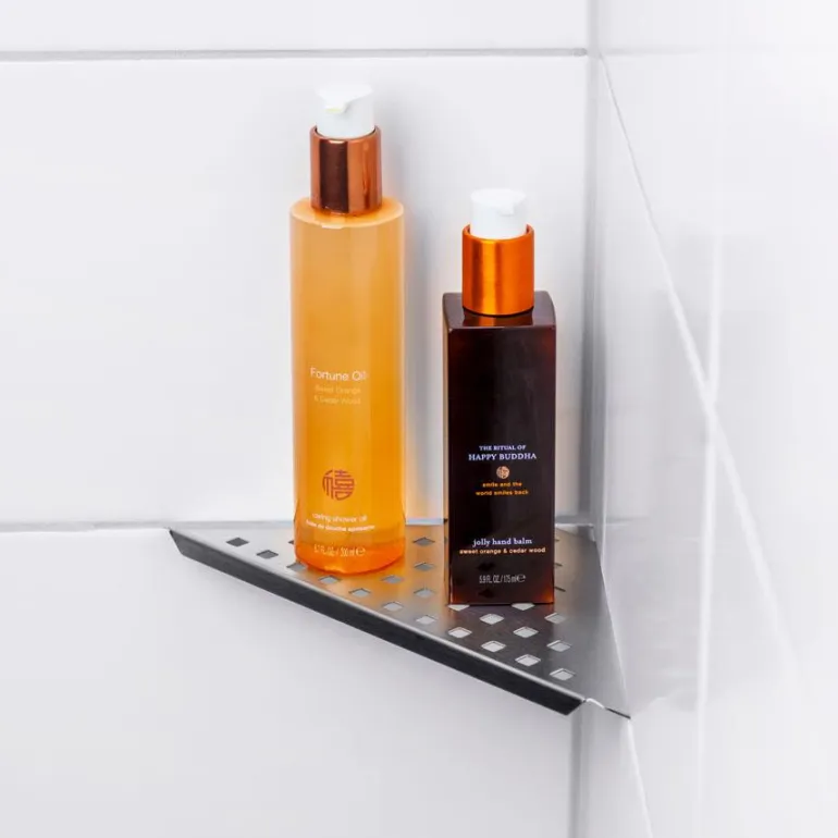 Tyylikäs suihkuhylly harjatusta ruostumattomasta teräksestä, tyyppi AISI 304. Hylly sopii 90 asteen kulmaan ja kiinnitetään liitokseen silikonilla.