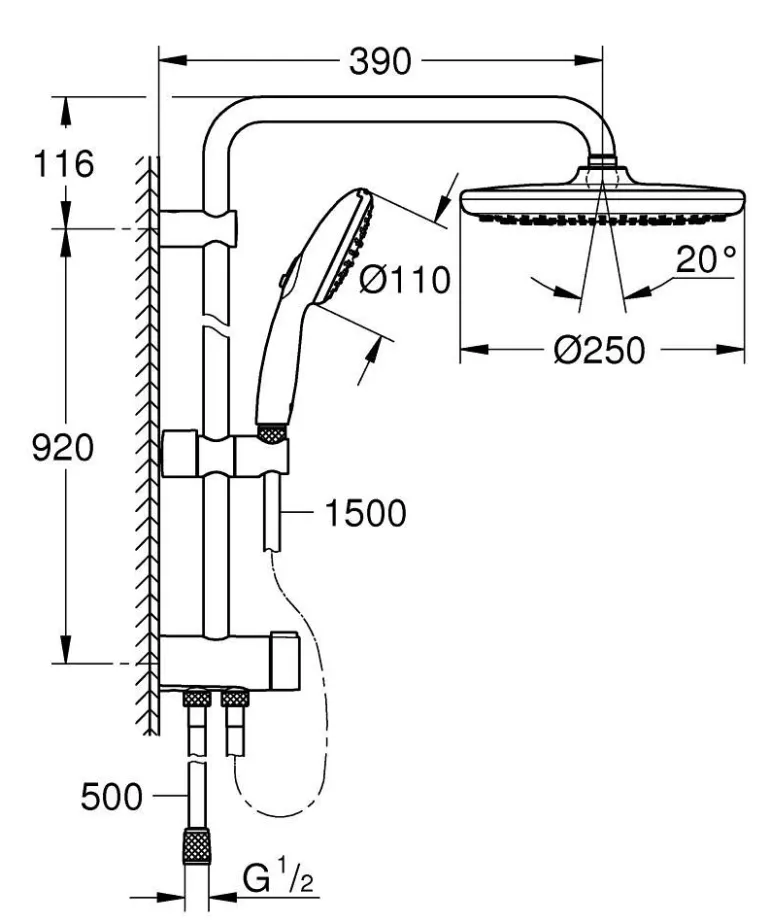 Säädettävä korkeus käsisuihkulle liukuelementin avulla