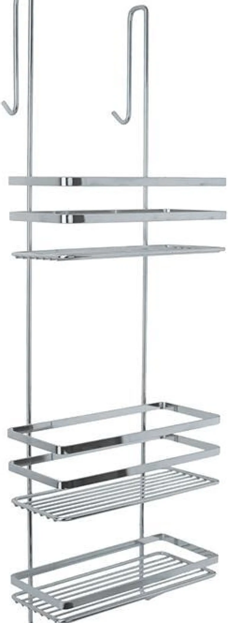 Suihkun seinähylly, jossa kolme tasoa ja korkeus 79 cm. Suihkuhylly ripustetaan suihkukaapin seinälle tai lasiseinälle.
