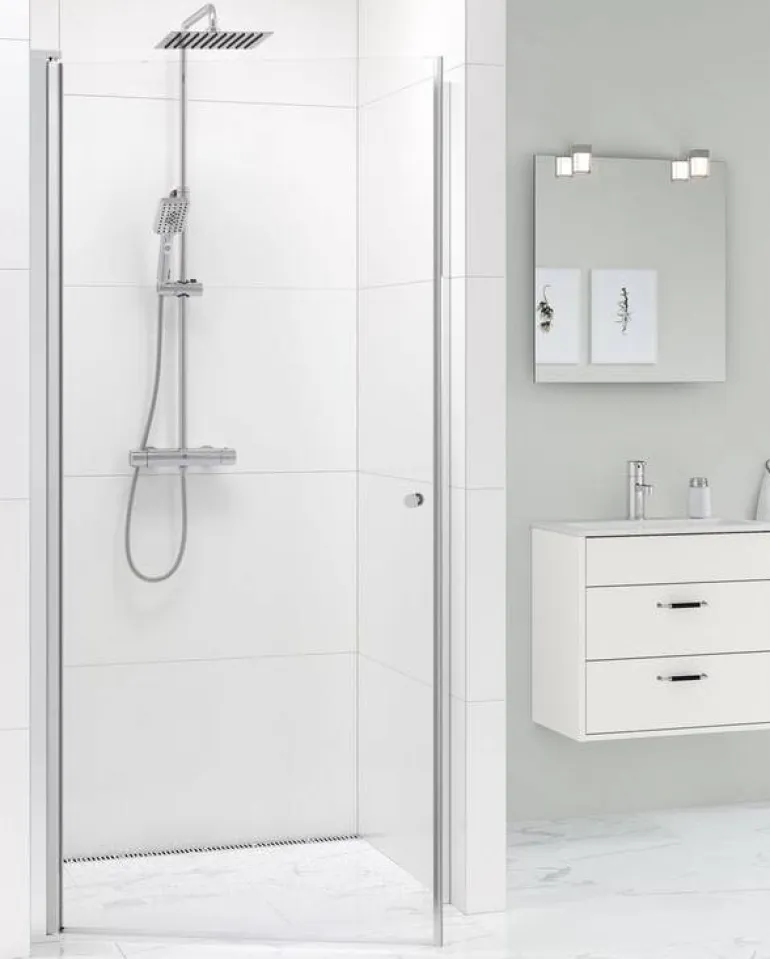 Square -suihkuovi syvennykseen. Karkaistu turvalasi ja esiasennetut oviprofiilit, jotka on nopea ja helppo asentaa. Mallia on saatavana eri mitoilla ja erilaisilla profiileilla (musta/kromi).