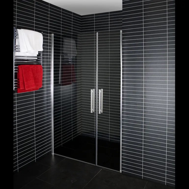 Sävytetty kaksisuuntainen ovi, joka asennetaan syvennykseen kahden seinän väliin, kulmaan. Ovi on turvalasia ja 6 mm paksu. Toimitukseen sisältyy hopeanvärinen kiiltävä seinäprofiili.