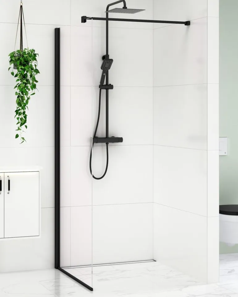 Gustavsberg Square on kiinteä suihkuseinä karkaistusta turvalasista (6 mm), jossa mattamustat profiilit ja seinätuki. Seinätuki on säädettävissä välillä 800-1000 mm.