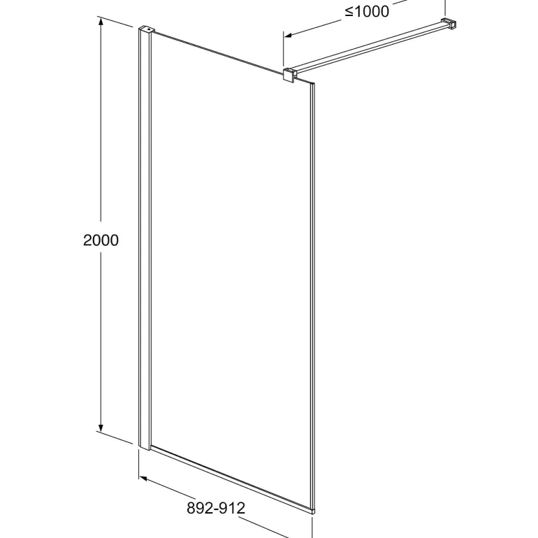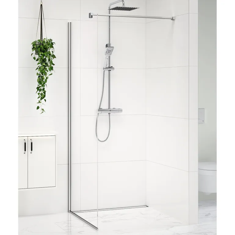 Kiinteä suihkuseinä, tasolasi 90 cm, asennettavissa oikealle/vasemmalle avautuvaksi. Kiillotetut profiilit ja seinätuki. Voidaan yhdistää Square suihkuoveen.