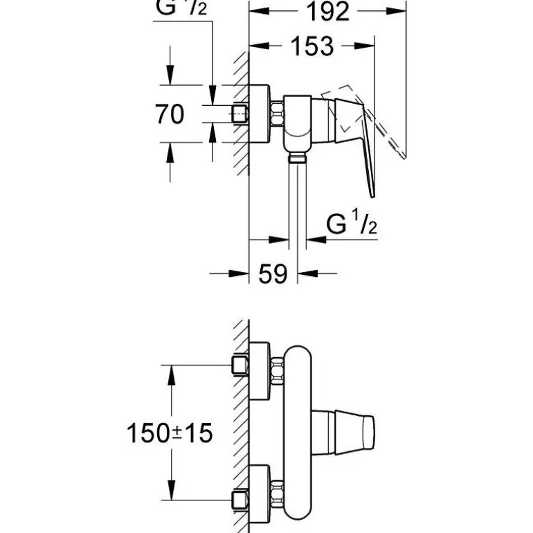 Yksikahvainen sekoitin suihkuun DN 15 -seinäasennuksella. Suihkuliitäntä 1/2″ alapuolella sisäänrakennetulla takaiskuventtiilillä.