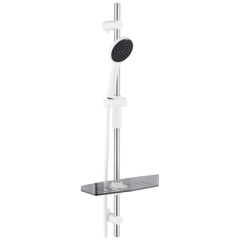 DIVELLO Hydro 1F -suihkusetti, joka koostuu käsisuihkusta 175 cm:n suihkuletkulla (1/2″) ja 90 cm:n suihkutangosta kestävällä saippua- ja shampoohyllyllä (Ø 22 mm).