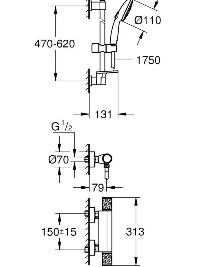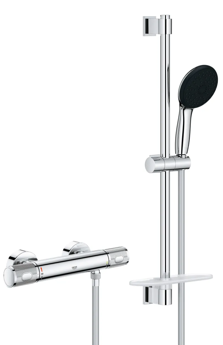 Grohe Precision Feel -suihkusetti suihkutangolla, käsisuihkulla (Rain, Jet, Massage) ja termostaattisella suihkuhanalla 1/2″ (DN 15), 150 c/c . Setti sisältää Precision Feel termostaattisen suihkuhanan 1/2″, Vitalio Start 110 suihkusetin 600 mm suihkutangolla ja Vitalio Universal suihkutangon hyllyn. Soveltuu ruuvikiinnitykseen (ruuvit ja tulpat sisältyvät toimitukseen) tai asennukseen liimalla (Grohe QuickGlue S 41 247 000 tuote myydään erikseen – 2 x tarvitaan). Suihkutangon kapasiteetti: max. 20 kg. Kapasiteetti koskee staattista (hitaasti lisättyä) kuormitusta ja vain tuotteelle tarkoitettuun käyttöön.