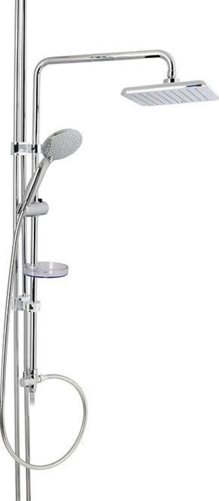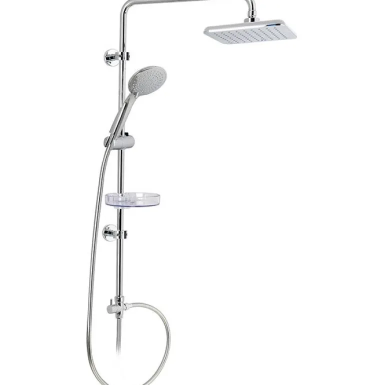 Kalkkia hylkivä suihkusetti, jossa on yläsuihku, hierova käsisuihku ja vaihdin suihkutyypin valintaan sekä saippuakuppi ja muovinen liitäntäletku.
