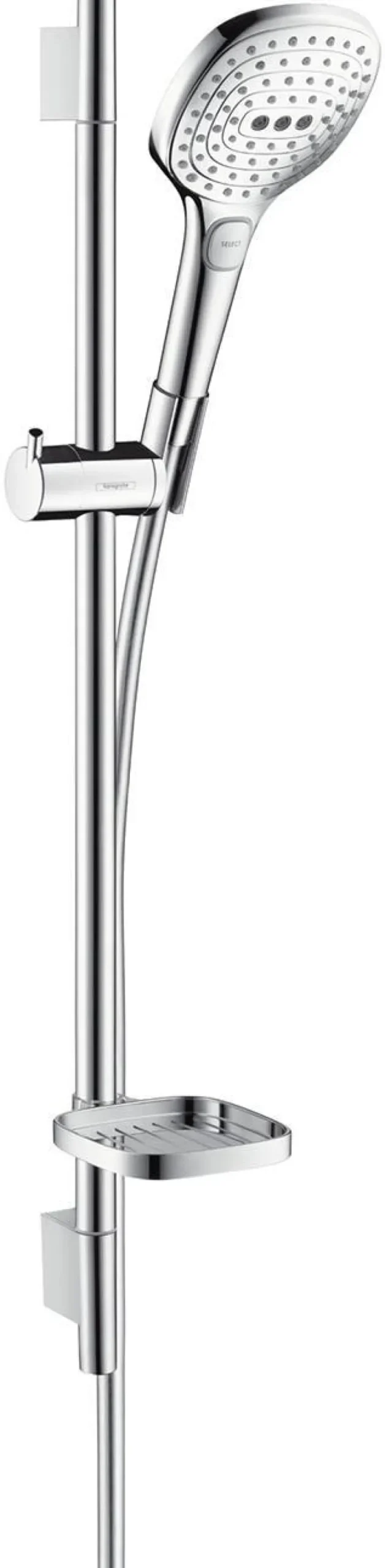 Suihkusetti Raindance Select E120 3jet, joka sisältää käsisuihkun, suihkutangon, suihkuletkun, liukusäätimen ja saippua-astian.