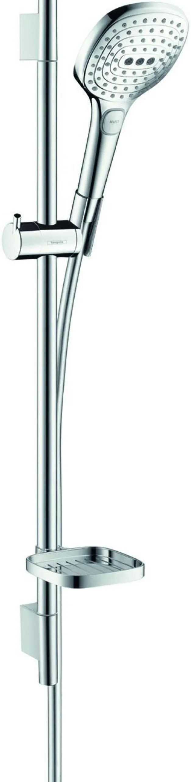 Suihkusetti Raindance Select E120 3jet, joka sisältää käsisuihkun, suihkutangon, suihkuletkun, liukusäätimen ja saippua-astian.