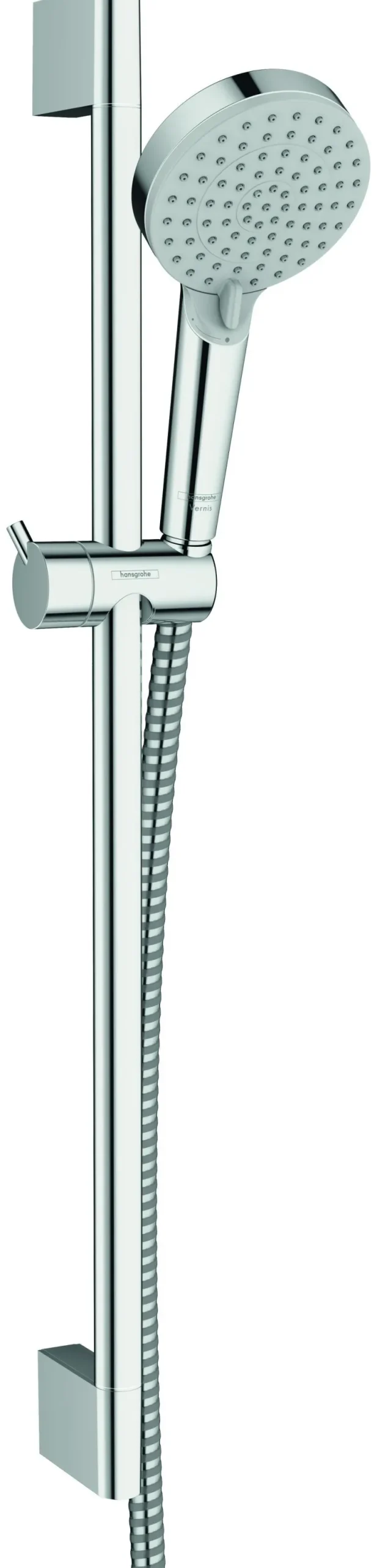 Hansgrohe Vernis on suihkusetti, joka sisältää käsisuihkun, suihkutangon, suihkuletkun ja liukukiinnikkeen. Crometta -suihkutanko 65 cm. Kromi/valkoinen.