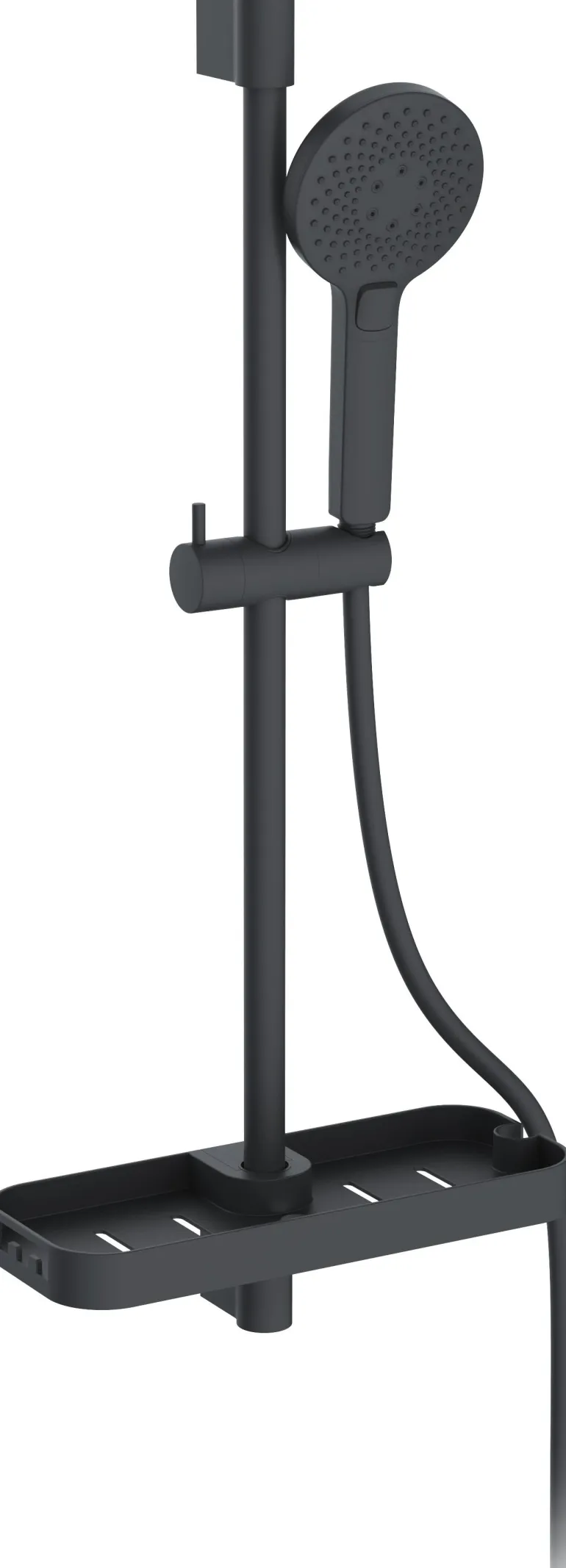 Arrow SlimLine on mattamusta suihkusetti (Black Edition). Sisältää 750 mm suihkutangon, säädettävän käsisuihkun, saippuahyllyn ja suihkuletkun 1,5 m.