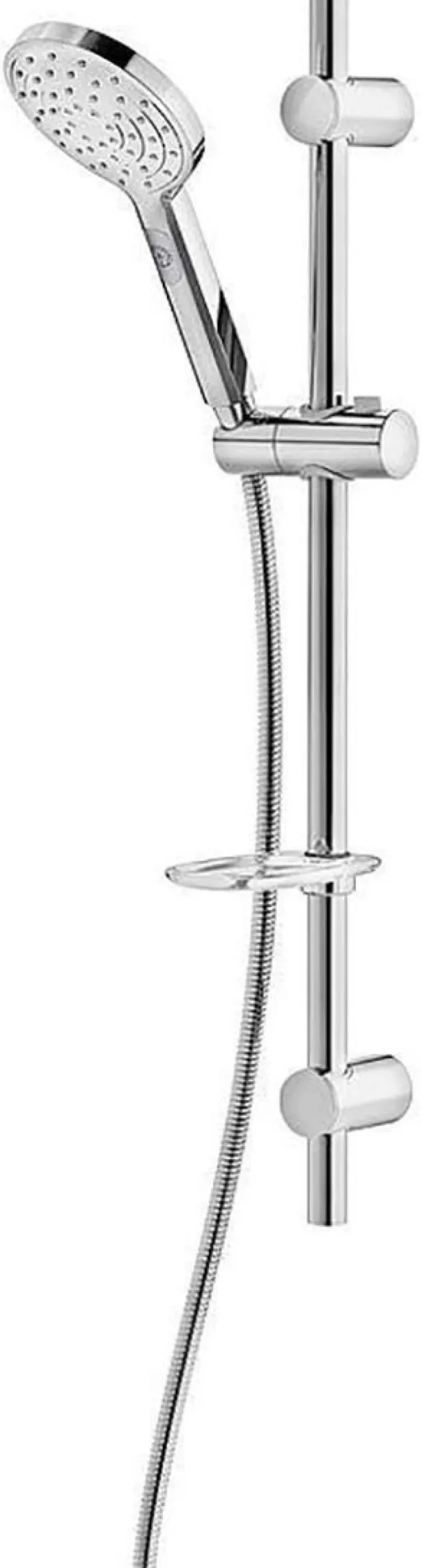 3 -toiminen käsisuihku painikkeella. Easy clean -pinnalla. 1,75 m suihkuletku. Asennetaan ruuveilla tai liimalla. Säädettävät cc-mitat (max. 605 mm). Saippuateline mukana.
