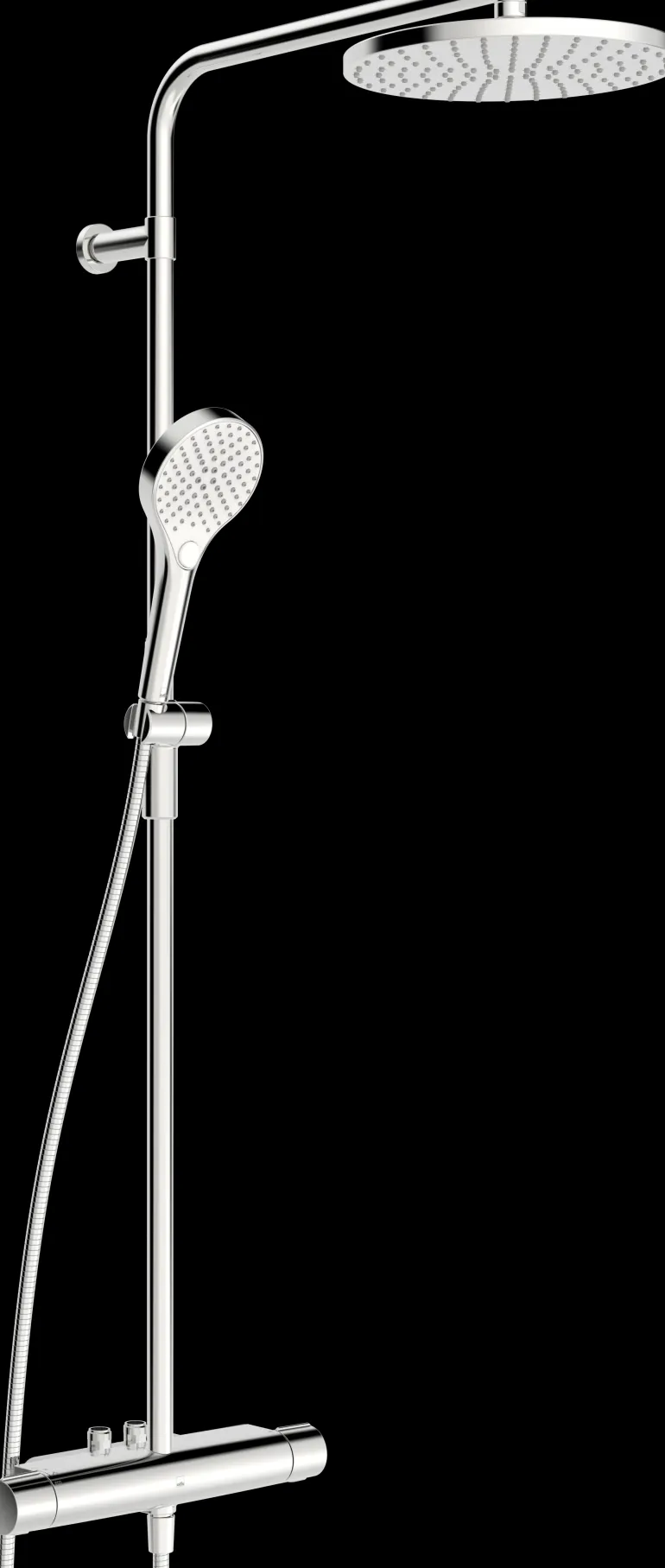 Suihkusetti termostaattisella hanalla sekä ylä- ja käsisuihkulla. Käyttäjäystävällisillä kahvoilla (lämmönsäätökahvassa turvanuppi 38°C:n kohdalla).