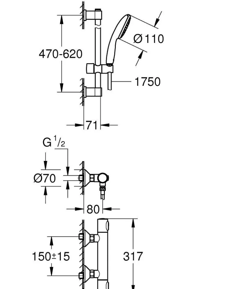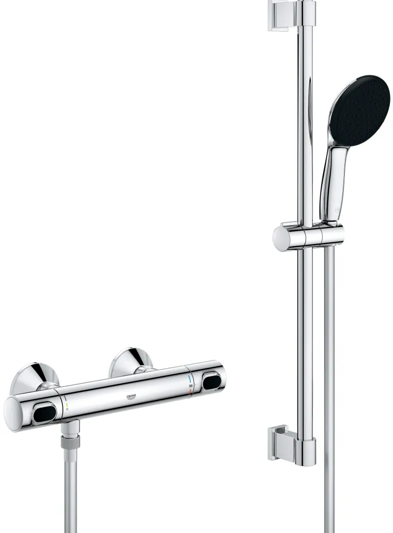 Grohe Precision Flow -suihkusetti suihkutangolla, käsisuihkulla (yksi suihkutyyppi Rain) ja termostaattisella suihkuhanalla 1/2″ (DN 15), 150 c/c. Setti sisältää Precision Flow termostaattisen suihkuhanan 1/2″ ja Vitalio Start 110 suihkusetin 600 mm suihkutangolla. Soveltuu ruuvikiinnitykseen (ruuvit ja tulpat sisältyvät toimitukseen) tai asennukseen liimalla (Grohe QuickGlue S 41 247 000 tuote myydään erikseen – 2 x tarvitaan). Suihkutangon kapasiteetti: max. 20 kg. Kapasiteetti koskee staattista (hitaasti lisättyä) kuormitusta ja vain tuotteelle tarkoitettuun käyttöön.