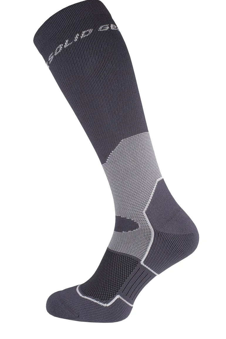 Sukan erityinen kudottu rakenne ja paksumpi materiaali varpaissa, päkiässä ja kantapäässä toimivat iskunvaimentimena. Mukava sukansuu pitää Solid Gear -kompressiosukat vakaasti paikoillaan juuri polven alapuolella. Asteittainen kompressio ja ilmanvaihto parantavat suorituskykyä ja käyttömukavuutta. Sukassa on napakka istuvuus nilkan ja pohkeen ympärillä. Litteä huomaamaton sauma varpaissa tarjoaa erinomaisen mukavuuden. Solid Gear -kompressiosukka parantaa verenkiertoa, lyhentää lihaksesi palautumisaikaa työstä tai treenistä ja tarjoaa mukavan tuen pitkille vaelluksille.