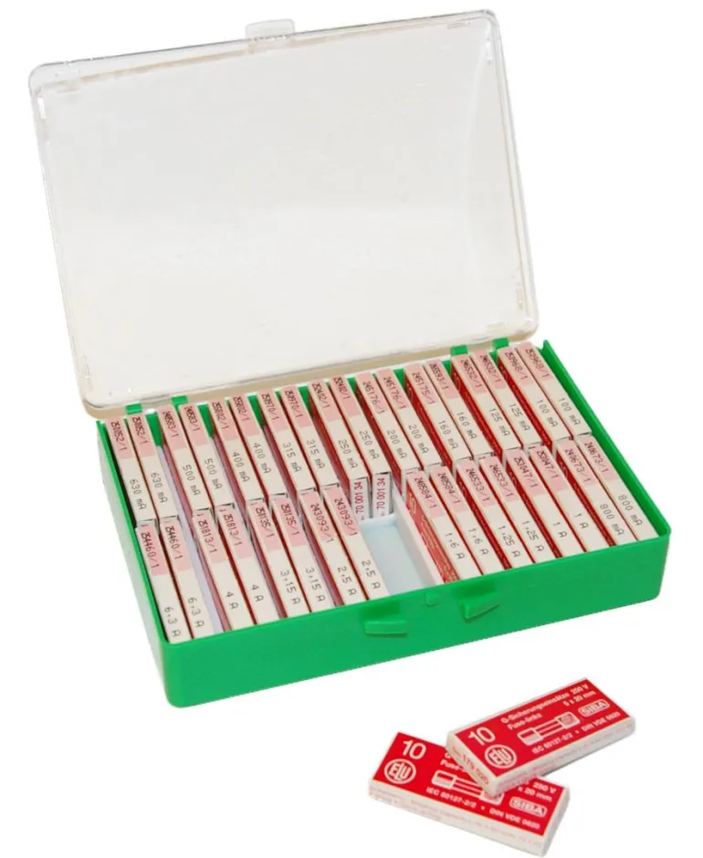 Lajitelmalaatikko sisältää nopeita sulakkeita, 5 x 20 mm. Laatikko sisältää yhteensä 360 sulaketta 100 mA – 6,3 A (20 kpl kutakin kokoa).