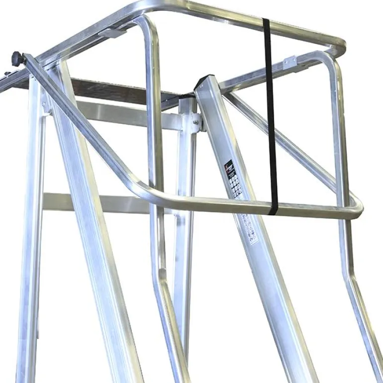 Kokoontaitettava suojakaide työtasoille. Kaide kiinnitetään tikkaiden yläosaan, jossa se muodostaa työtason ympärille turvakehikon, joka suojaa putoamiselta kaikkiin suuntiin.