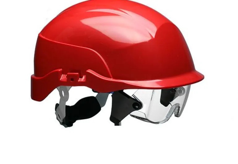 Teollisuus- ja rakennussuojakypärä, sisäänrakennettu visiiri ja pyöräsäätö. Visiirin koko mahdollistaa omien silmälasien käytön sen alla.