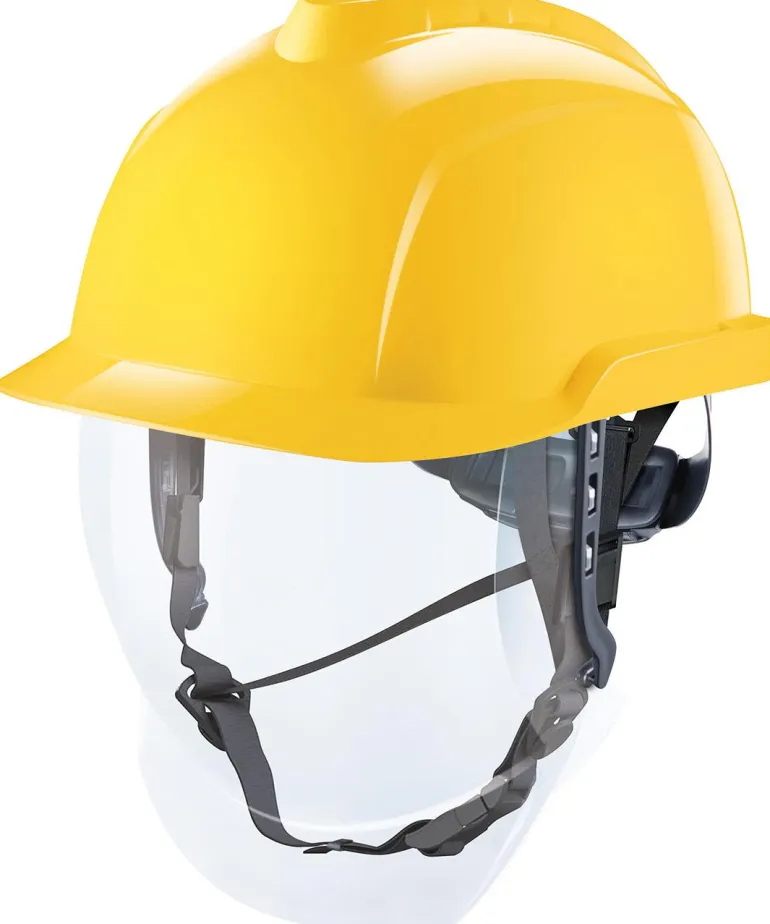 V-Gard 950 ”Arc” Ilman ilmanvaihtoa, ihanteellinen öljy- ja kemianteollisuuteen sekä sähkötöihin/asennustöihin. Tasapainoinen kypärä integroidulla kasvovisiirillä, joka sopii yhteen silmälasien kanssa ja jossa on 2 asentoa kasvosuojalle (taitettuna ylös tai kokonaan alas), huuruuntumisen ja naarmuuntumisen esto, Phase-Trac III -säätöpyörä yksilöllistä säädettävyyttä varten.