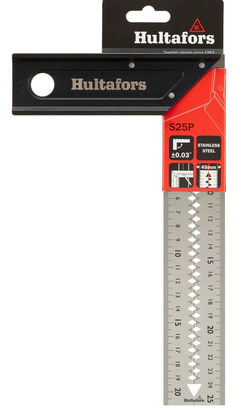 Hultafors Pro S25P on ammattikäyttöön kehitetty kestävä tarkkuussuorakulma. Merkintälovet merkitsemiseen tai tukemiseen kipsilevyjen yms. leikkaamisessa. Syväetsattu millimetriasteikko 45 mm leveän terän molemmilla puolilla. Reikä varmistusnauhaan kiinnittämistä varten. Terä on valmistettu ruostumattomasta teräksestä, koko 1,5 x 45 mm. Toleranssi +/-0,03 astetta.