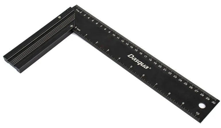 Dasqua 513914 on musta-anodisoitu suorakulma laserkaiverretuilla asteikoilla molemmilla sivuilla. Varustettu myös 45°:een mittauskulmalla. Tuote on korroosionkestävä.