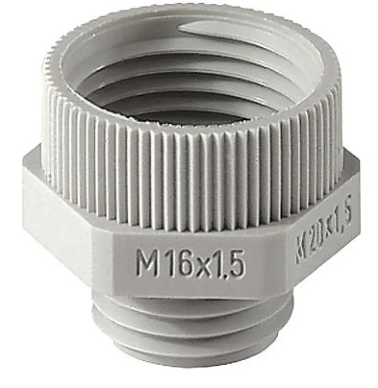 Harmaata lasikuituvahvistettua polyamidia, RAL 7035. Pieni metrinen ulkokierre ja suuri metrinen sisäkierre.
