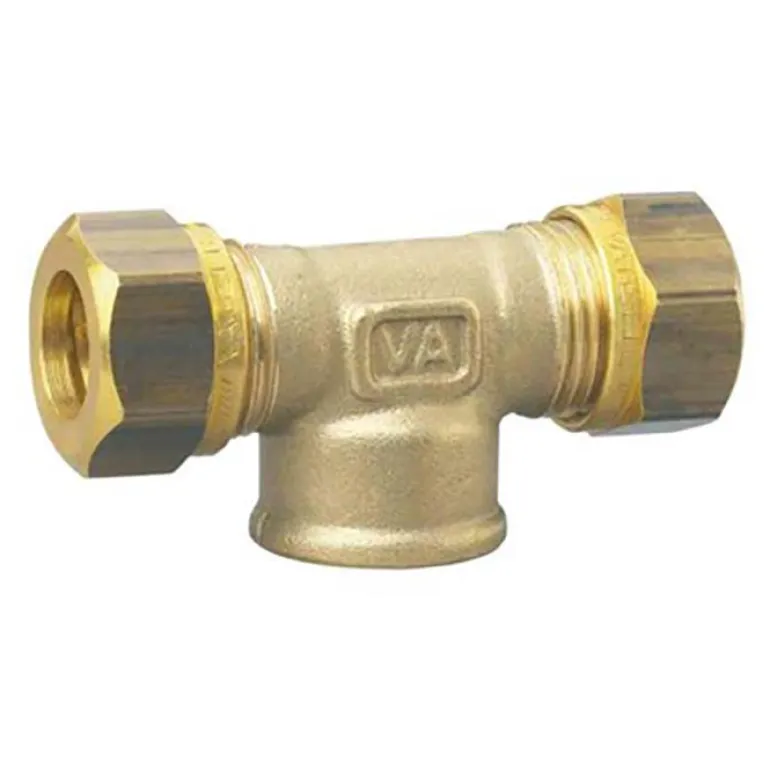 T-liitin kupariputkeen, teräsputkeen ja PEX-putkeen. Liitin on 90°:n kulmassa, ja siinä on sisäkierre keskellä.