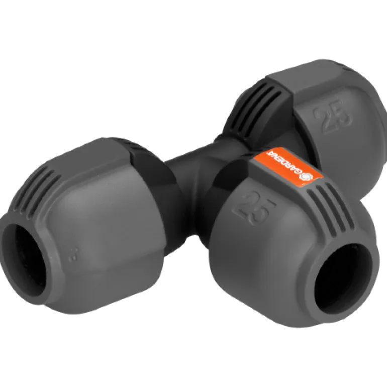 GARDENA-sadetinjärjestelmässä 25 mm:n T-liitintä käytetään runkoputken helppoon haaroittamiseen. Patentoidun Quick & Easy -liitostekniikan ansiosta putkisto voidaan koota ilman työkaluja