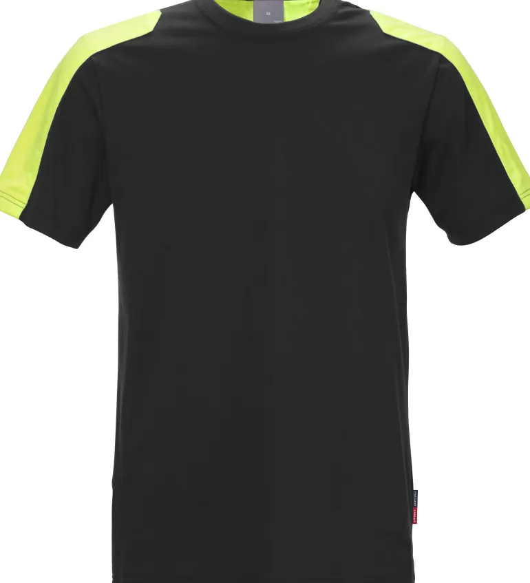 Joustavasta materiaalista valmistettu Öko-Tex-sertifioitu t-paita, jossa on joustava pääntie ja kontrastiväriset ompeleet. Olkapäiden ja käsivarsien keltaiset osat parantavat näkyvyyttä.
