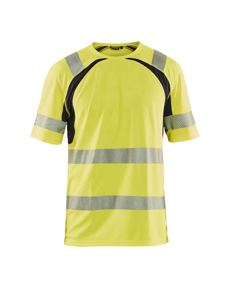 Pyöreä pääntie. Paneelit optimaalista kosteuden siirtoa varten. Strategisesti sijoitetut saumat minimoivat hankautumisen hihojen alla. Painatus – Blåkläder. UV-suojattu materiaali. Verkkopaneelit eniten hikoilevilla alueilla. 50 mm leveät heijastimet. Materiaali: 100 % polyesteria, birdseye knit wicking Antiodor 140 g/m2. Pesuohje: Pesukertojen määrä: x 50. 60 °C. Ei valkaisua. Ei kuivapesua. Ei silitystä. Rumpukuivaus – matala.