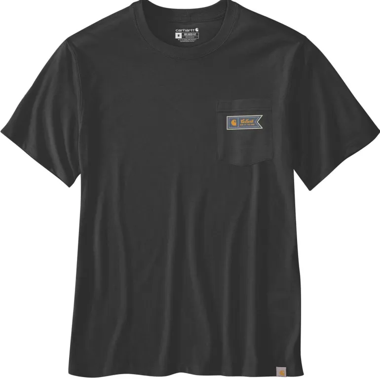 Carharttin 107063N04 T-paita pehmeää puuvillan ja polyesterin sekoitetta (60 % puuvilla ja 40 % polyesteri 5 oz/yd² – 170 g/m², Lightweight Jersey Cotton/Poly Vortex). Kevyttä ja hengittävää kangasta. Lyhyet hihat (Short Sleeve), ribbineulottu pyöreä pääntie ja kaksoisneulottu litteä sauma helmassa. Relaxed Fit -istuvuus (reilu). Rintataskulla, jossa Carhartt ”Logo” -painatus.