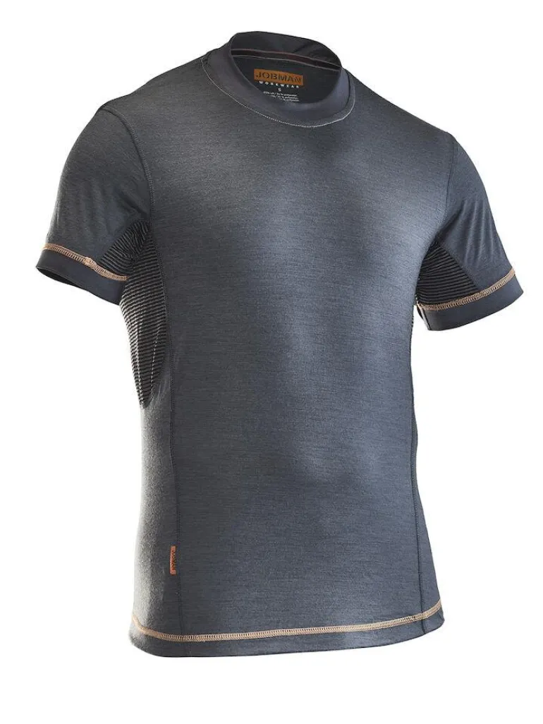 Jobman Dry-tech 5595 on t-paita, jossa lämpöä eristävää merinovillaa ja kosteutta siirtävät polyesteriosat.
